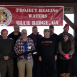 Project Healing Waters is a national movement serving wounded American veterans. The Project Healing Waters program in Fannin County is called River*ence, the brainchild of local businessman Peter Knutzen and Trout Unlimited volunteer Carl Riggs. Riggs, himself a military brat, is a local and statewide Trout Unlimited leader, currently the Chairman of the Georgia State Trout Unlimited Council, the top volunteer in the state. River*ence is the crown jewel of the local Trout Unlimited veteran efforts, and there are many other formal and informal opportunities to serve vets in VA centers and in the community. This is the third year for River*ence, and three “alumni” of the pro-gram, Josh, Larry, and Jeremy, are back as guides or “river friends” along with several volunteers from Blue Ridge Mountain Trout Unlimited and other Georgia TU chapters. Ten vets from four different wars are guests from Friday to Sunday in cabins donated by Riggs’ neighbors along a stretch of private trout water. Riggs has amassed loaner wading gear for the vets who lack gear, and each vet will get a fly rod, reel, and line and leader to keep. Financial and in-kind donations locally and from around the country provide equipment, catered food, lodging, and a picturesque location with trout ponds for the Friday’s casting instruction. All the vets needed to bring was the clothes on their back.